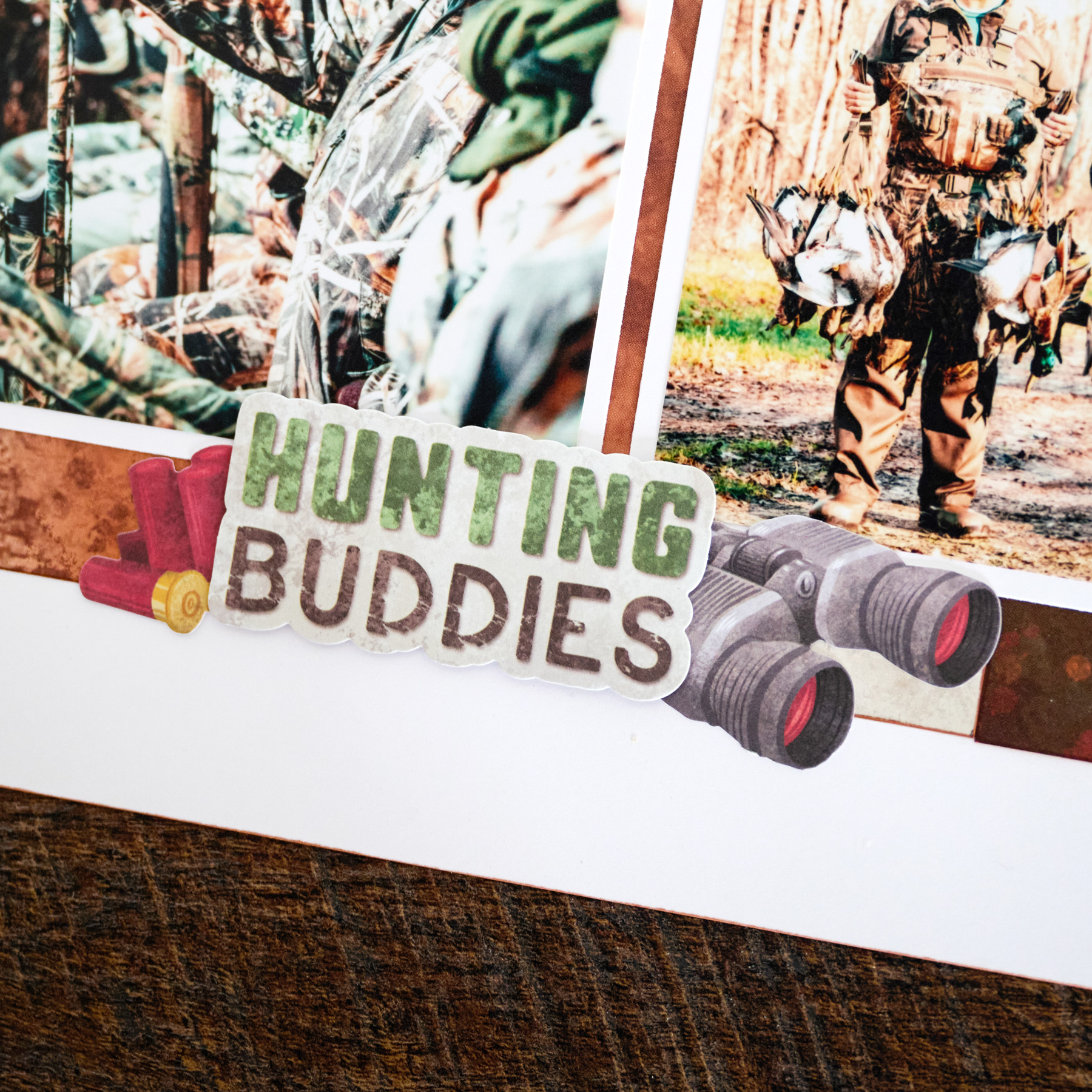 Step 5: Locate the mat card that says, “the great outdoors.” Cut the brown ends off the card making it 4-1/2″ × 3-1/2″. Tuck at an angle to the right of the large photo mat. Finish with the Grateful Harvest Hunting Embellishments using Foam Squares as desired.