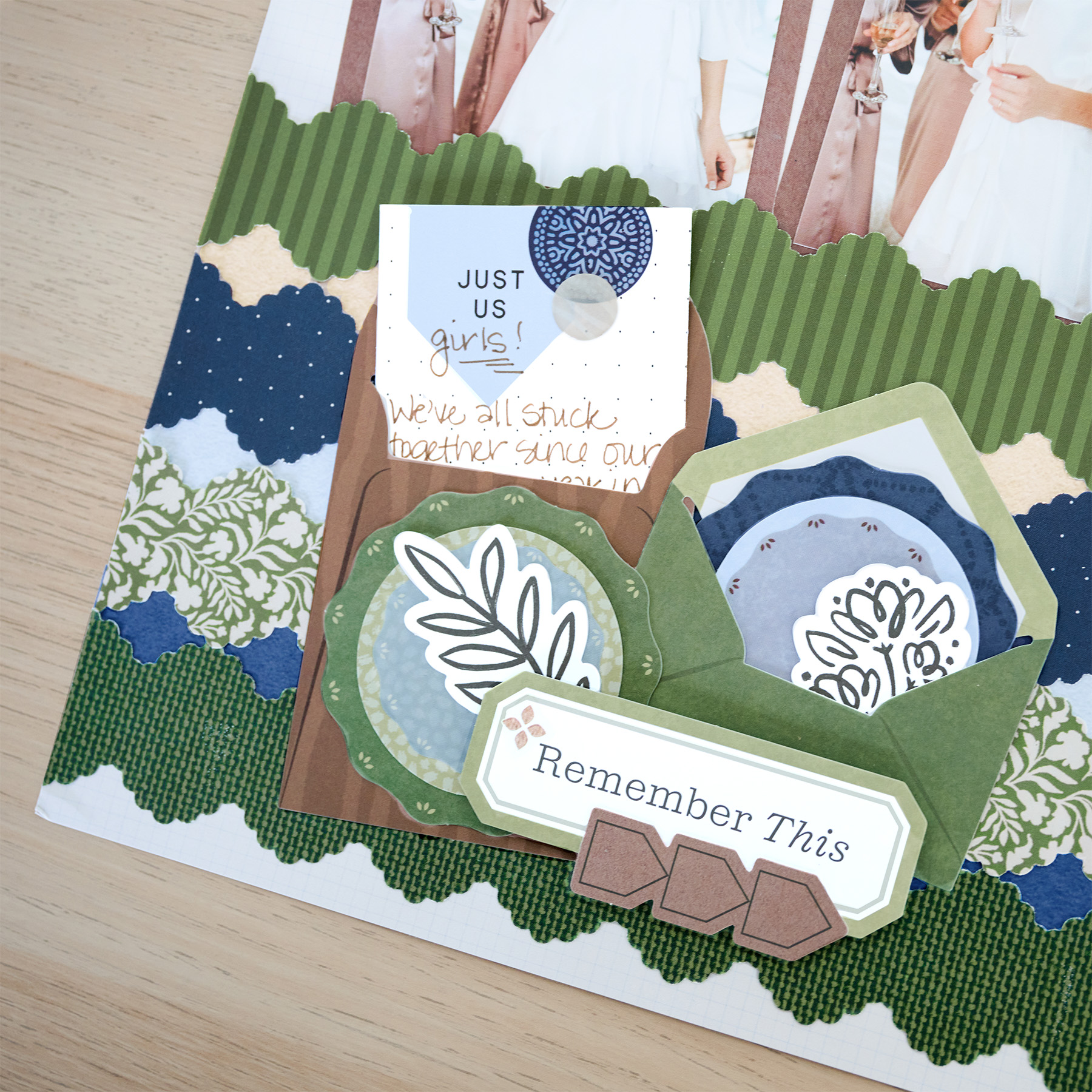 Step 7: Adhere the brown envelope embellishment above the punched strips at a slight angle. Trim down a half mat from the Variety Mat Pack or a piece of scrap paper to measure 2-3/8″ x 4″ for your journaling, inserting it into the brown envelope embellishment.