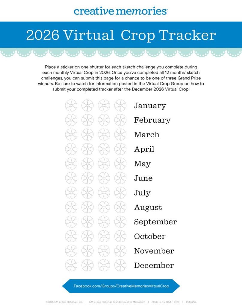 Color in or place a sticker on one shutter for each sketch challenge you complete during each monthly Virtual Crop in 2026. Once you’ve completed all 12 months’ sketch challenges (that’s 48 completed pages you’ll be adding to your albums), you can submit your tracker for a chance to be one of three grand prize winners! More information on how to submit will be shared in the Virtual Crop Group as we near the final sketch challenge.