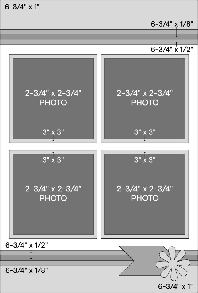 On this version, three 4″ x 3″ photos and one 2″ x 2″ photo fit comfortably. Even without the layered background papers, the overall feel of the sketch remains clean and recognizable.