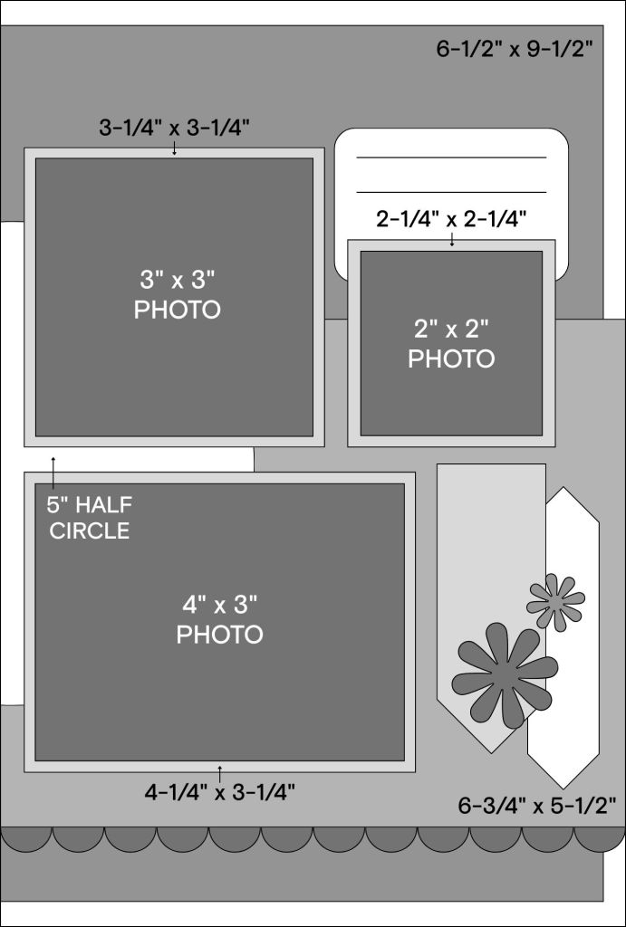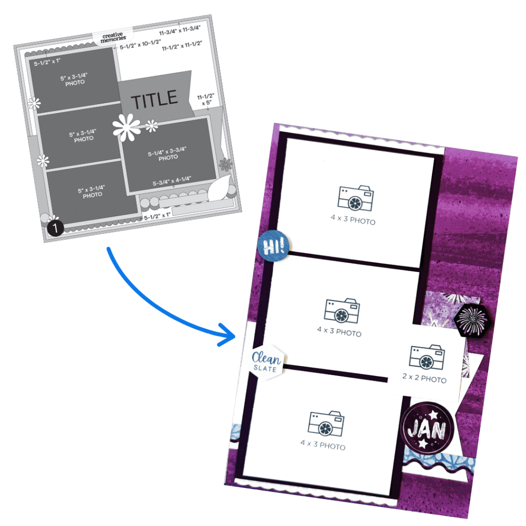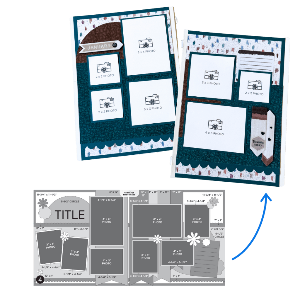 As more scrapbookers fall in love with Creative Memories’ Scrap Journal, adapting 12″ x 12″ Virtual Crop sketches to fit 6.75″ x 10″ pages becomes a fun creative challenge! The most important thing to keep in mind is that every element is simply on a smaller scale, but you are not limited to sticking to the sketch exactly!