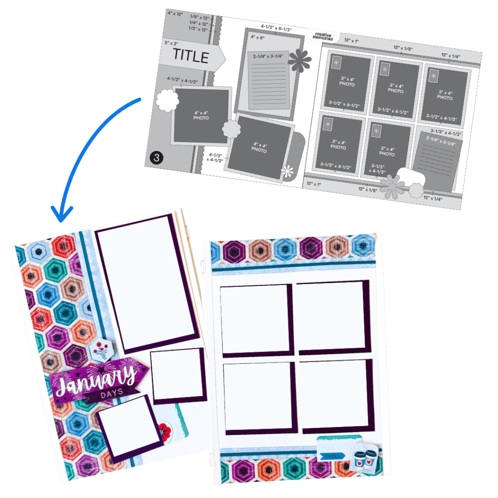 Sketch #1 from the January Virtual Crop translates nicely to a single Scrap Journal page. To adapt it, start by simplifying the background. Instead of layering multiple patterned papers, use one patterned sheet as your base. Slightly narrow the horizontal strips or tags so they don’t overwhelm the page, and recreate decorative borders above and below the photo strip using a decorative blade in your 12-inch Trimmer.