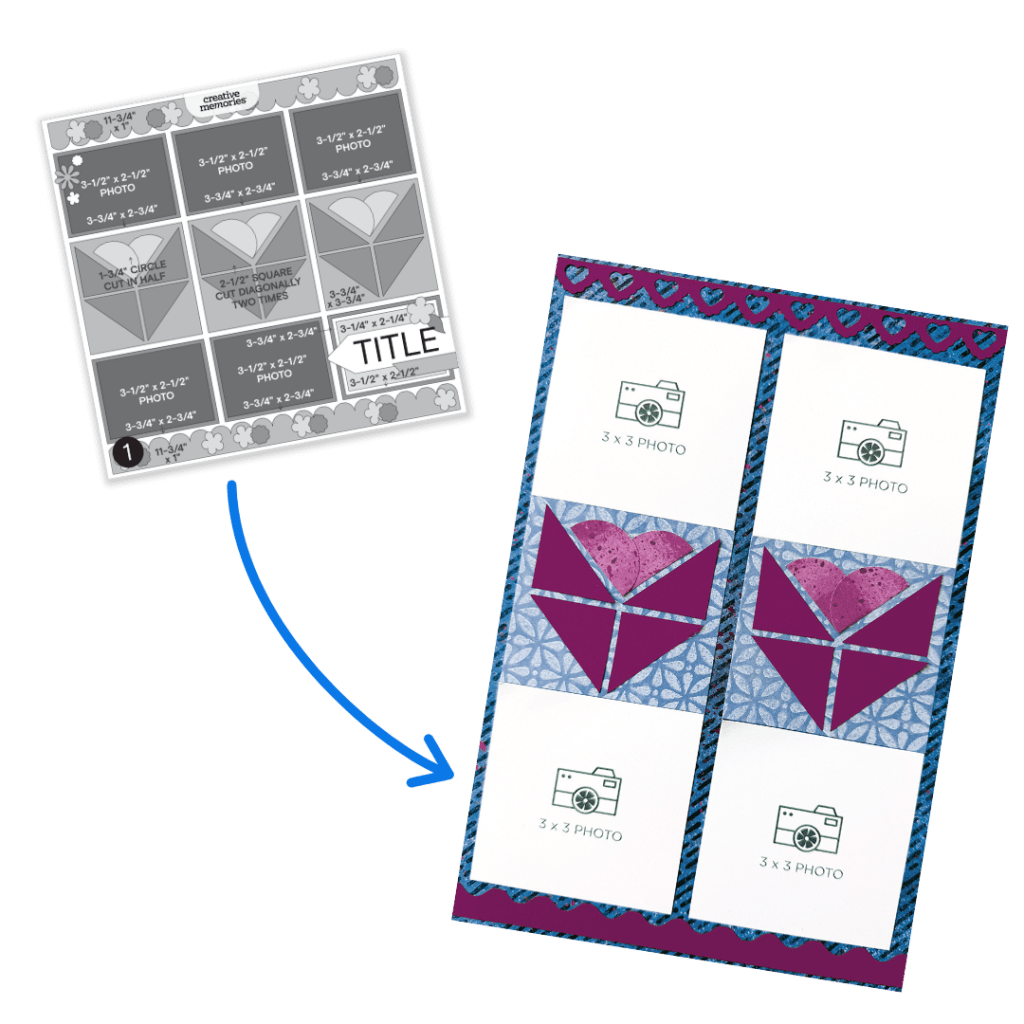 This sketch adapts beautifully when spread across two Scrap Journal pages. To create a cohesive look, position the main design elements closer to the center of each page so the layout feels connected across the spread. To add interest without adding bulk, use a decorative blade on the 12-inch Trimmer along the patterned paper strips on the outer edges. This adds texture while keeping the design light and balanced.