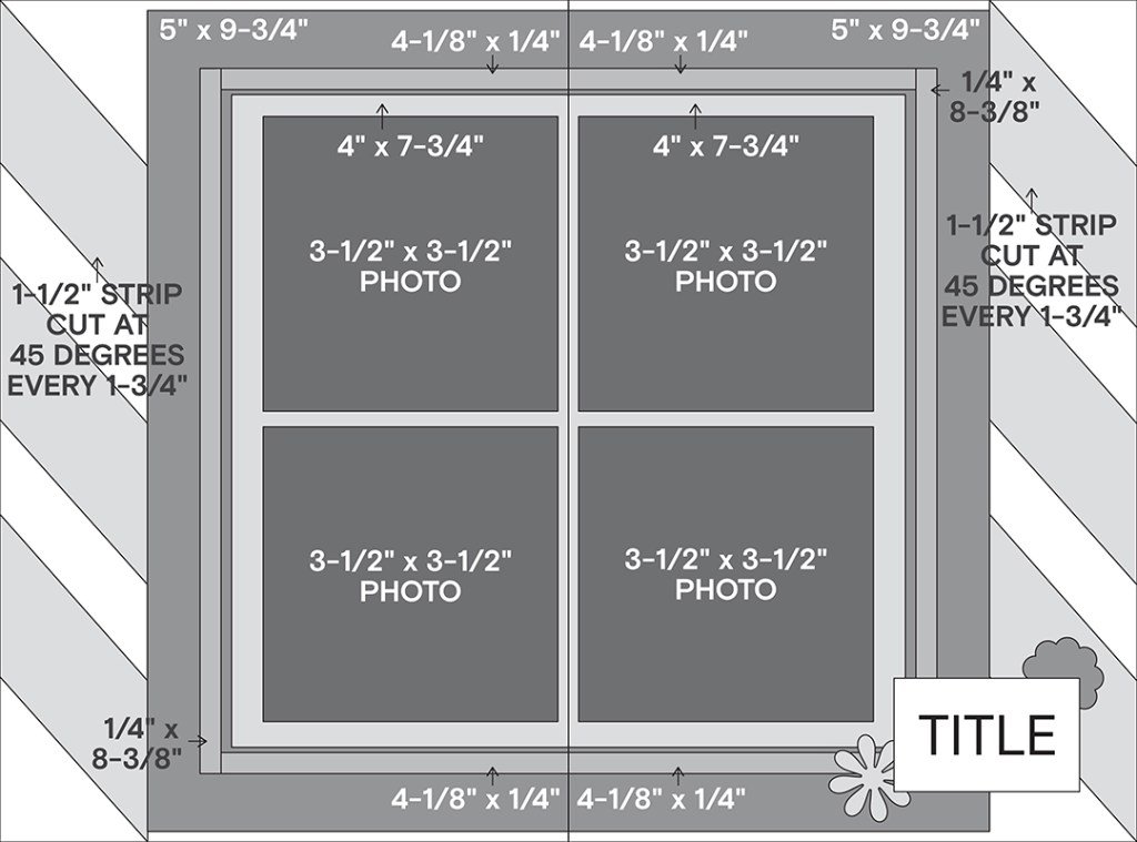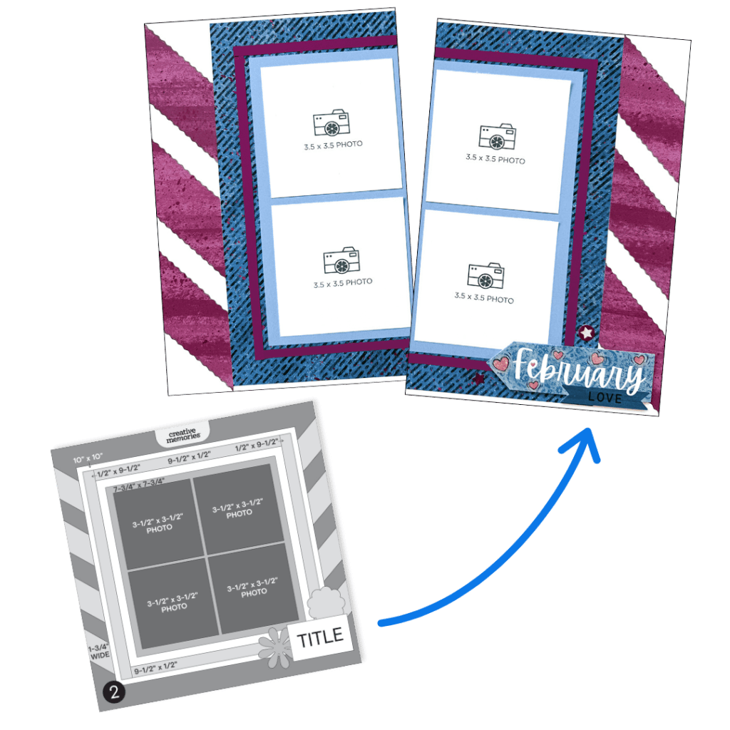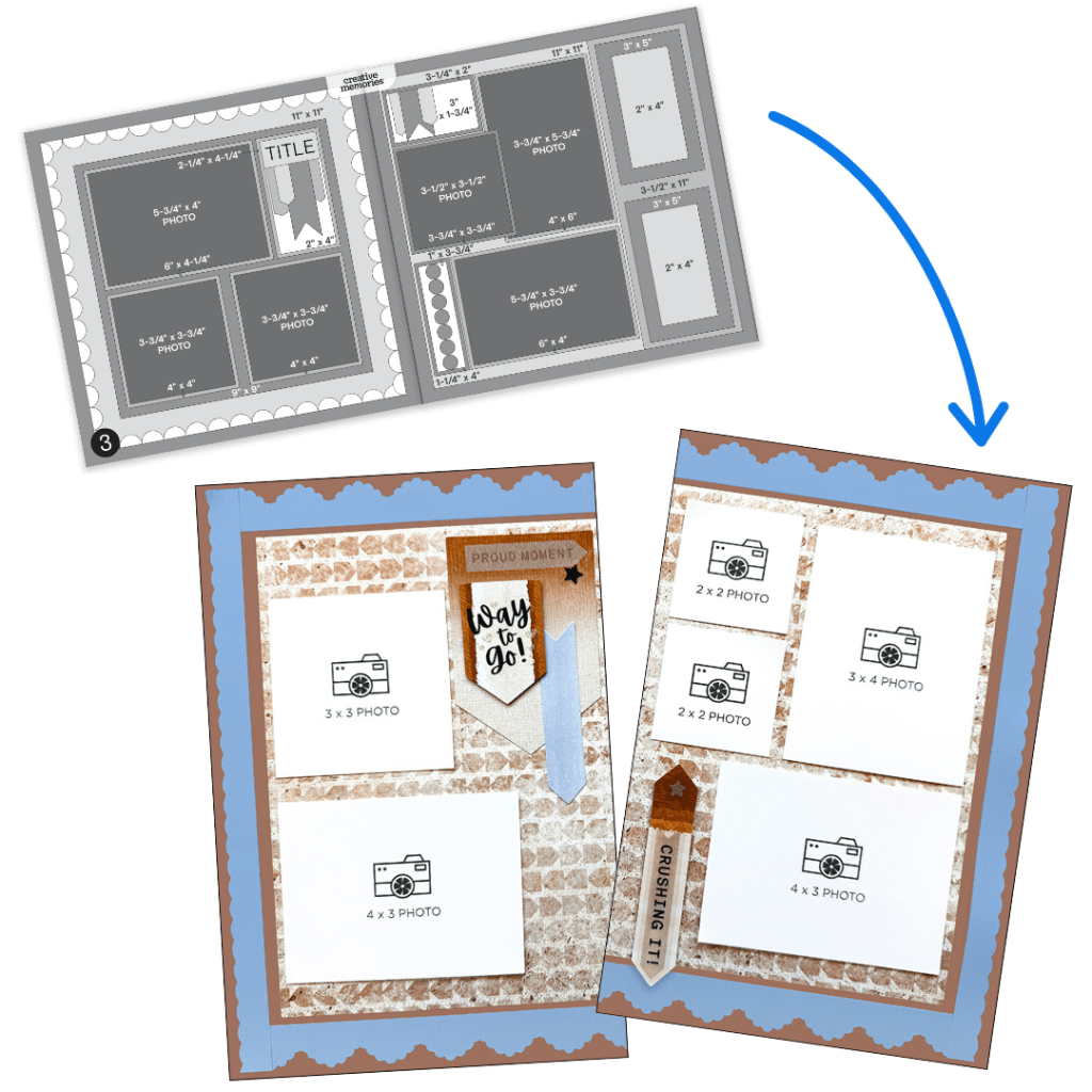This version makes a few thoughtful adjustments while still staying true to the original sketch. Instead of limiting the decorative border to one page, extend it across both pages to create a more unified look. Keep the layering and photo placement similar, but scale everything down and remove the vertical column on the right side to better fit the narrower pages. There’s still room for multiple photos without the layout feeling crowded. For added contrast, consider matting the 4″ x 3″ photos with cardstock.