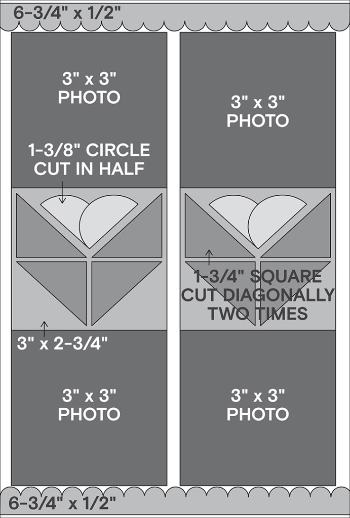 This layout stays very close to the original 12″ x 12″ sketch, with just one key adjustment. When converting to the 6.75″ x 10″ format, remove the third column of photos to create a more comfortable fit. From there, simply scale the remaining elements down slightly.