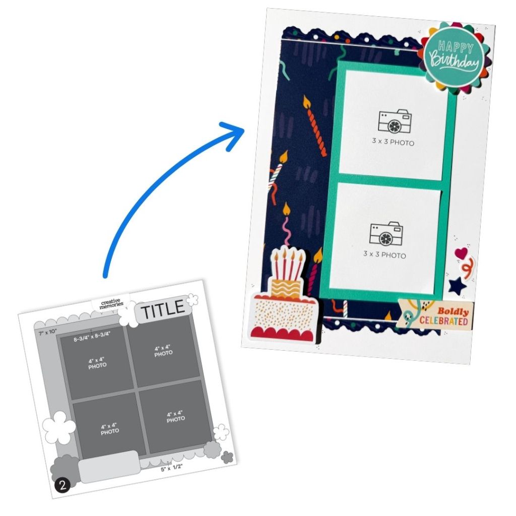 This sketch can easily be adapted into either a one-page or two-page Scrap Journal layout. For a single-page version, cluster two 3″ x 3″ photos on the same mat to create a strong focal point. Busy patterned papers, like the Bouncing Candle design, work especially well when layered behind a photo cluster. Let just a portion peek out to add energy without overwhelming the page.