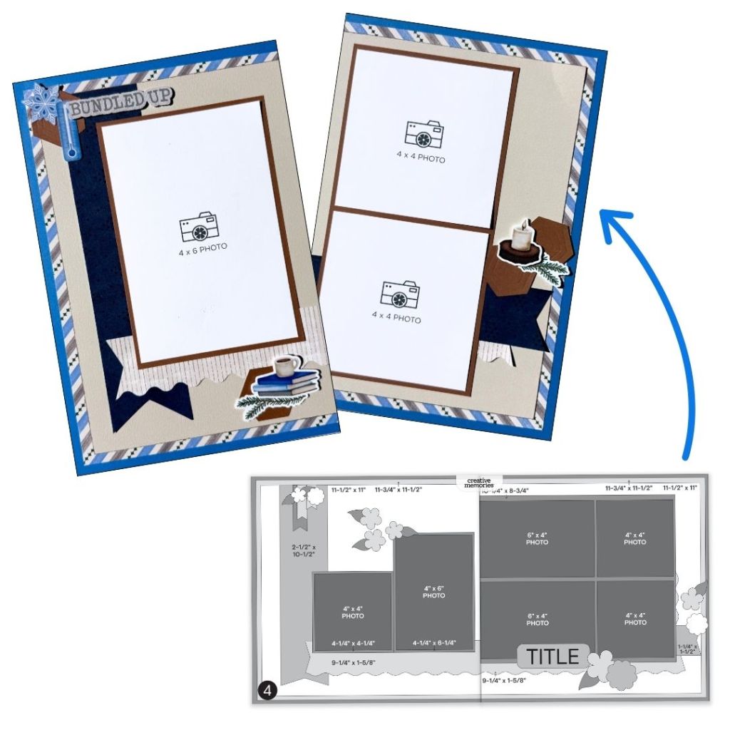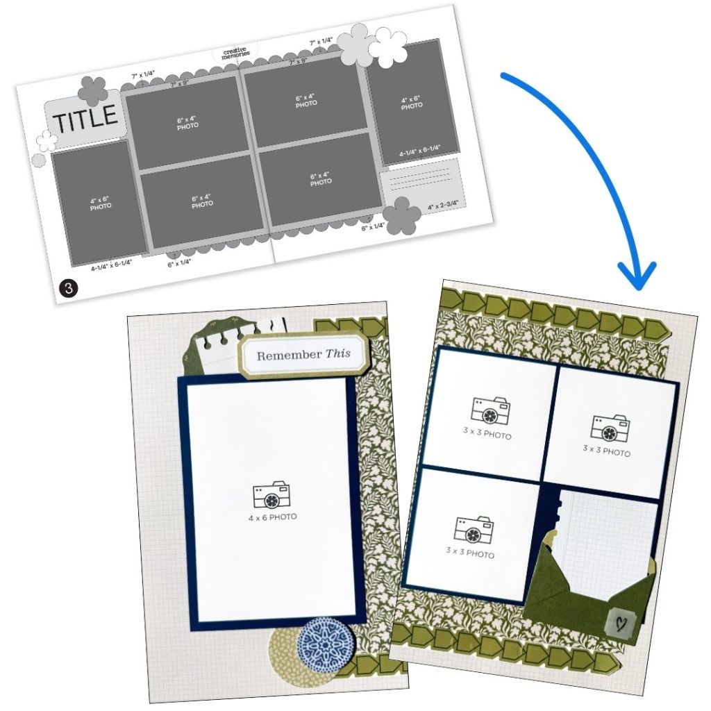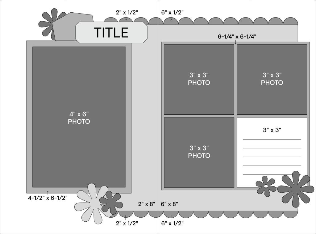 As more scrapbookers fall in love with Creative Memories’ Scrap Journal, adapting 12″ x 12″ Virtual Crop sketches from the Virtual Crop Group to fit 6.75″ x 10″ pages becomes a fun creative challenge! The most important thing to keep in mind is that every element is simply on a smaller scale, but you are not limited to sticking to the sketch exactly!